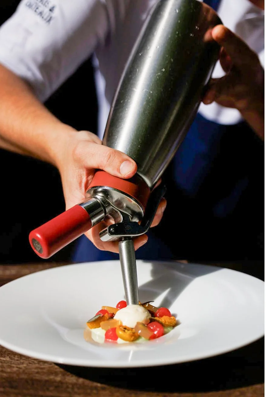 Tijdens Chefs in het Bos serveren Tim Bood en Hette Hettema een visionair Signature Dish dat hun blik op de toekomstkeuken perfect belichaamt. Zij presenteren een verrassende, vegetarische tartaar gemaakt van watermeloen, gemarineerd en gedroogd tot een onverwachte vleesstructuur. Dit wordt verrijkt met ingrediënten zoals kapperblad, tomaat, lavas, een sorbet van groene kruiden en een schuim van Parmezaanse kaas, aangevuld met verse kruiden uit eigen tuin.